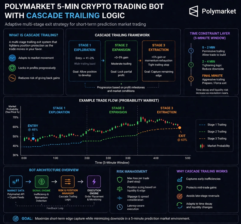 Cascade trailing logic is a three-stage exit system that progressively tightens profit protection as trades develop. Unlike fixed stop-losses that exit too early or too late, this approach adapts to market momentum. For prediction markets like Polymarket, where 5-minute crypto contracts create extreme volatility, cascade trailing can mean the difference between capturing a 6% gain and watching profits evaporate.