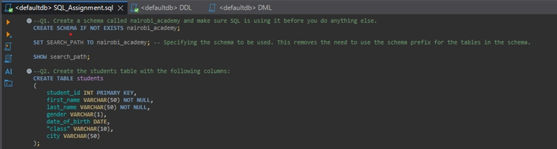 The developer started with CREATE commands to establish the foundation. First came a schema named nairobi_academy, then three core tables: students, subjects, and exam_results. Nothing fancy yet, just the skeleton.
