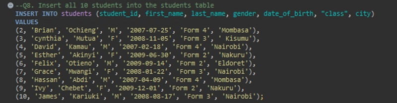 Without the WHERE clause, this UPDATE would change EVERY student's city to Nairobi. That's a nightmare scenario. Always double-check your WHERE conditions before running UPDATE or DELETE commands.